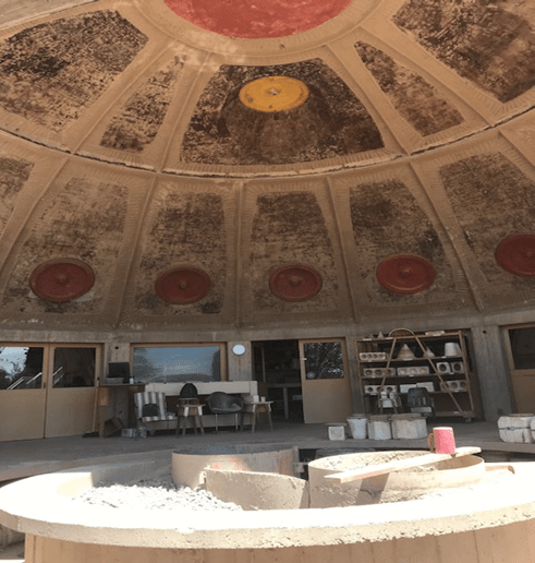 The major income producing portion of the community, is the design and production of copper and ceramic wind chimes, and vessels. A domed bronze and ceramic apse was built for the design and production of each piece. Artisans come from around the world to apprentice at the bronze foundry and ceramic apse.
